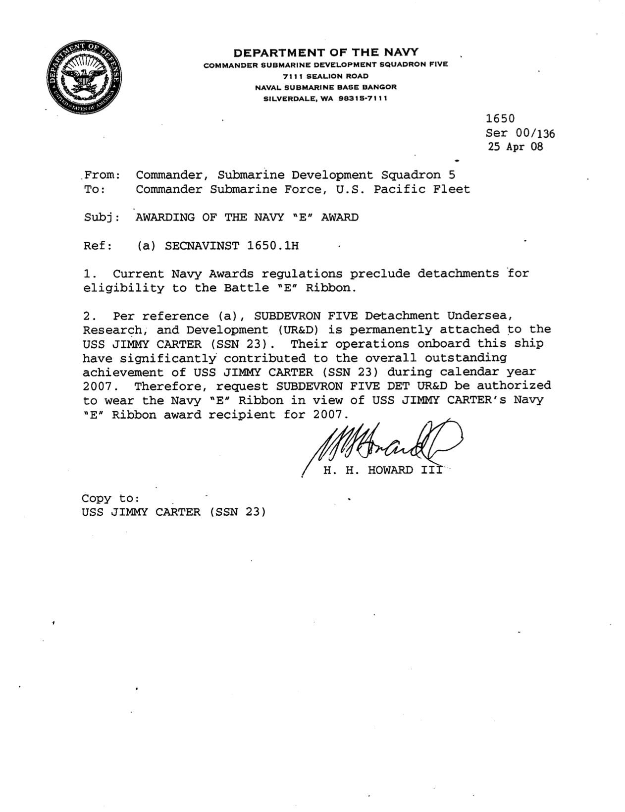 Navy E #4 by Daniel Osterday | Dec 31, 2007 | Navy Awards, Tour in SSN-23 Navy E, in Submarine Development Squadron Five, Detachment Undersea Research & Development. December 31, 2007 < Back